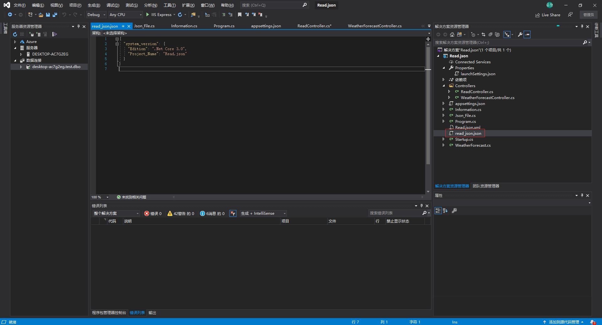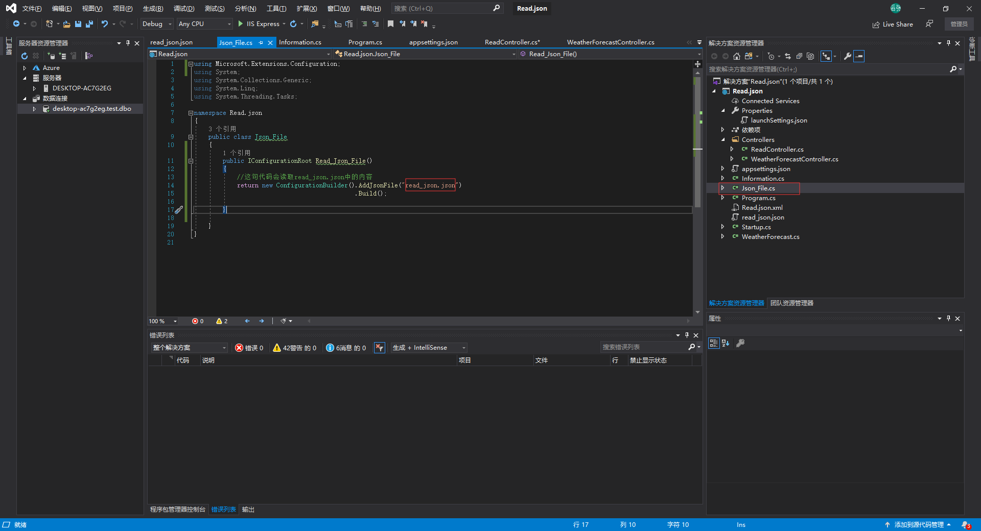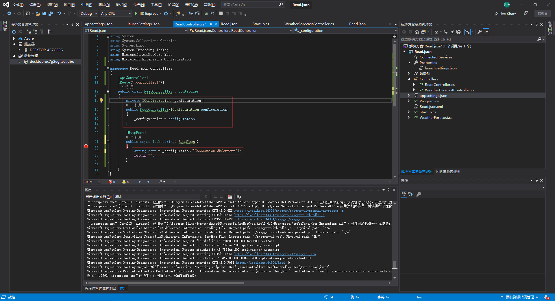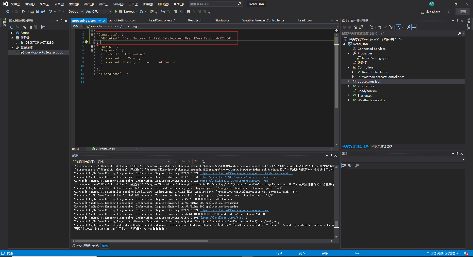 我们先在appsettings.json中配置好数据库连接字符串,然后读取它