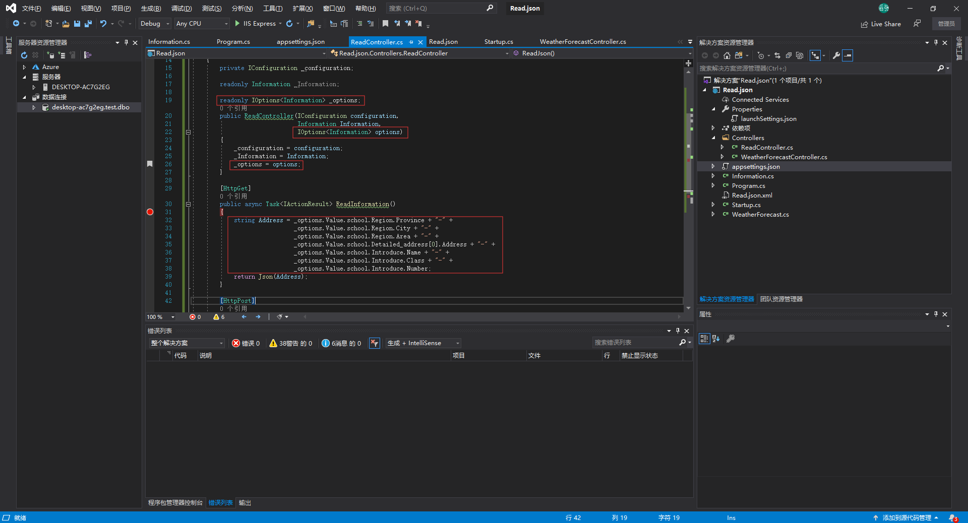 using System;using System.Collections.Generic;using System.Linq;using System.Threading.Tasks;using Microsoft.AspNetCore.Mvc;using Microsoft.Extensions.Configuration;using Microsoft.Extensions.Options;namespace Read.json.Controllers { [Route("api/[controller]/[action]")] [ApiController]public class ReadController : Controller {private IConfiguration _configuration;readonly Information _Information;readonly IOptions<Information> _options;public ReadController(IConfiguration configuration, Information Information, IOptions<Information> options) { _configuration = configuration; _Information = Information; _options = options; } [HttpGet]public async Task<IActionResult> ReadInformation() {string Address = _options.Value.school.Region.Province + "-" + _options.Value.school.Region.City + "-" + _options.Value.school.Region.Area + "-" + _options.Value.school.Detailed_address[0].Address + "-" + _options.Value.school.Introduce.Name + "-" + _options.Value.school.Introduce.Class + "-" + _options.Value.school.Introduce.Number;return Json(Address); } [HttpPost]public async Task<string> ReadJson() {string conn = _configuration["Connection:dbContent"];string commodity = _configuration["Content:0:Trade_name:test1"];return ""; } } }