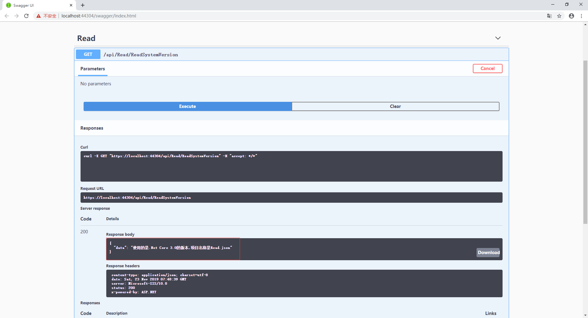 [HttpGet]public async Task<IActionResult> ReadSystemVersion() {var configuration = _json_File.Read_Json_File();string system = "使用的是" + configuration["system_version:Edition"] + "的版本" + "," +"项目名称是" + configuration["system_version:Project_Name"];return Json(new{ data = system }); }