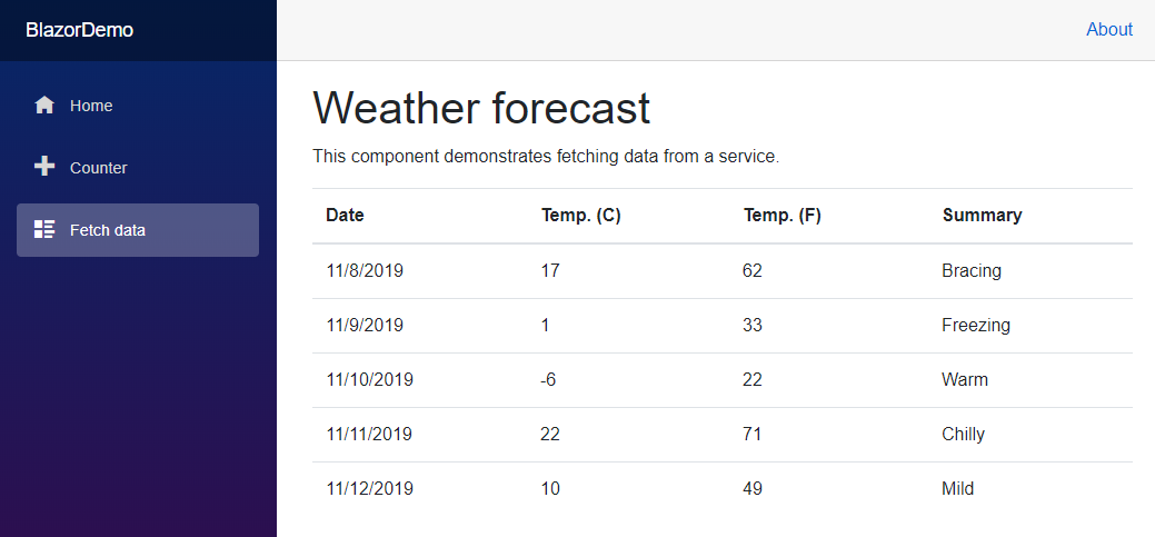 Blazor是一个客户端Web框架,使我们能够在客户端单页应用程序中使用C#。它的外观与Razor Pages应用程序非常相似。这个示例项目使我们能够从外部数据源获取ToDo列表项,添加新项,删除项。所有这些功能都发生在客户端。
