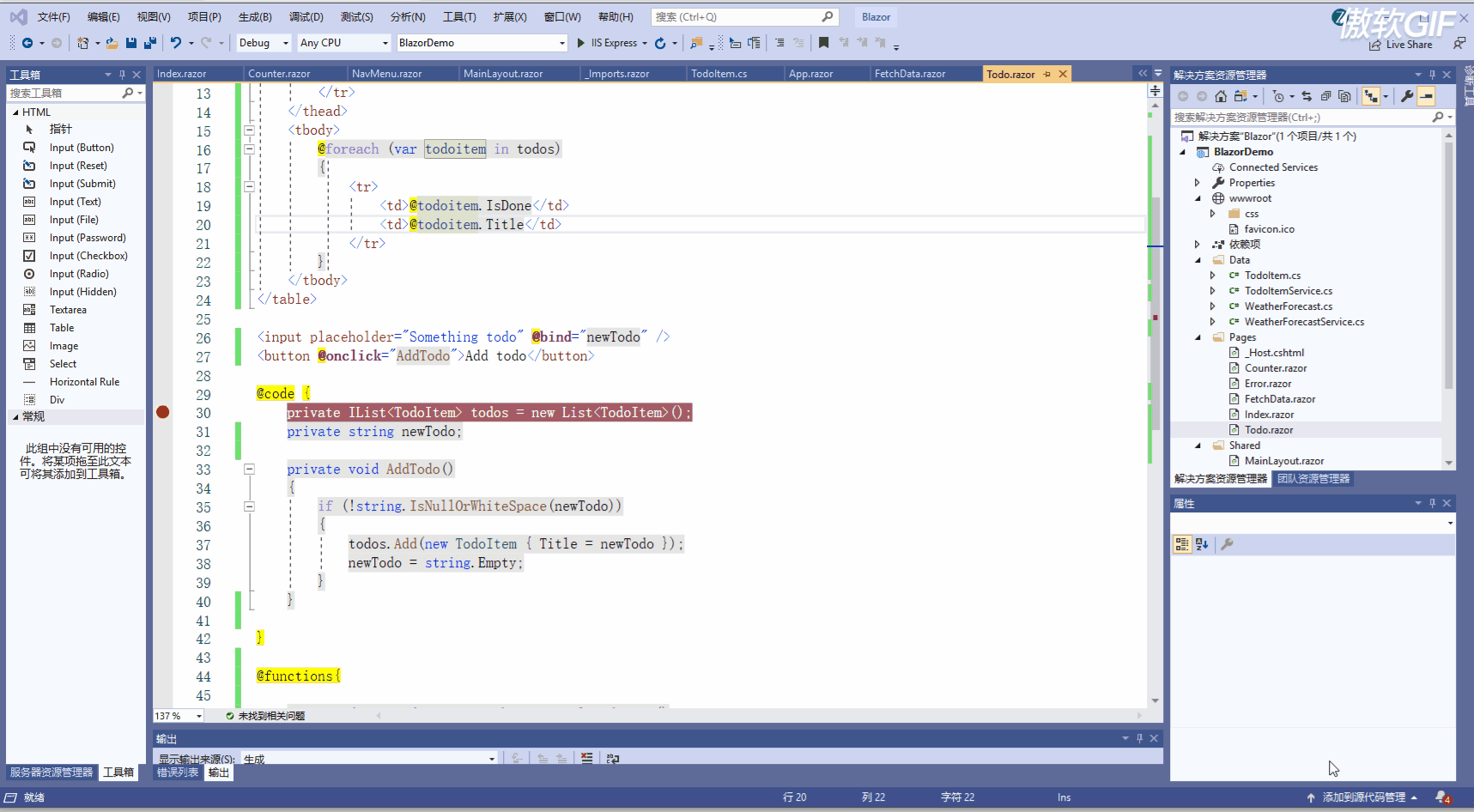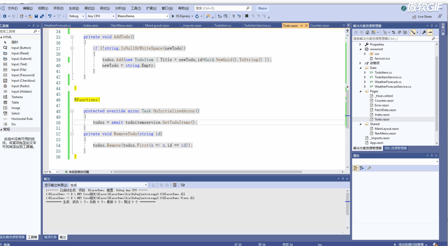 指令告诉Blazor使用依赖注入将一个类注入此页面。在本例中,我们正在注入 TodoItemService ,以便我们可以从之前创建的样本数据中读取。其该服务的定义如下,它简单的离谱。