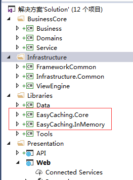 MemoryCache我们采用EasyCaching(可以从git上获取:https://github.com/dotnetcore/EasyCaching),由于本身提供的接口不满足需求,所以我们直接下载到本地,将EasyCaching.Core和EasyCaching.InMemory添加到项目中,如图所示: