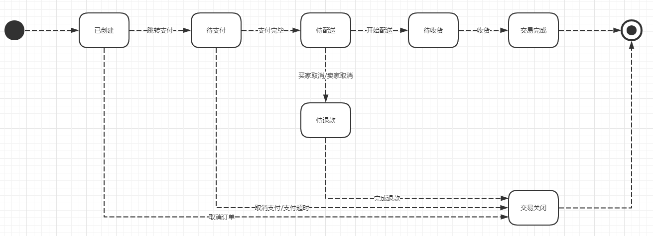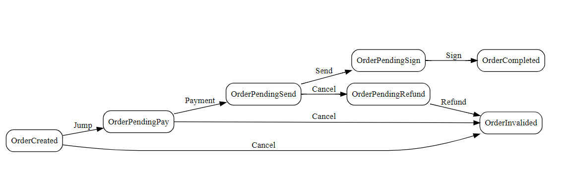 //流程配置orderStateMachine.Configure(OrderState.OrderCreated) .Permit(OrderTrigger.Jump, OrderState.OrderPendingPay) .Permit(OrderTrigger.Cancel, OrderState.OrderInvalided); orderStateMachine.Configure(OrderState.OrderPendingPay) .Permit(OrderTrigger.Payment, OrderState.OrderPendingSend) .Permit(OrderTrigger.Cancel, OrderState.OrderInvalided); orderStateMachine.Configure(OrderState.OrderPendingSend) .Permit(OrderTrigger.Send, OrderState.OrderPendingSign) .Permit(OrderTrigger.Cancel, OrderState.OrderPendingRefund); orderStateMachine.Configure(OrderState.OrderPendingSign) .Permit(OrderTrigger.Sign, OrderState.OrderCompleted); orderStateMachine.Configure(OrderState.OrderPendingRefund) .Permit(OrderTrigger.Refund, OrderState.OrderInvalided);