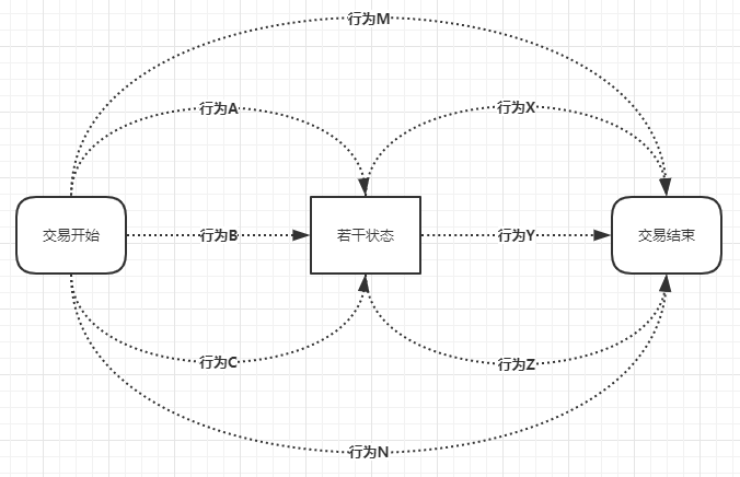 在采用stateless简化一下上面这个流程设计,也作为对stateless的一次掌握,看下简化后的流程设计能否带来什么意想不到的事情。stateless采用行为触发方式推动流程进行,比如说a状态要变到b状态,要经过一个行为,不管是买家点击,卖家点击,定时任务,其它行为触发后的联动触发等,都是以行为进行驱动的,
