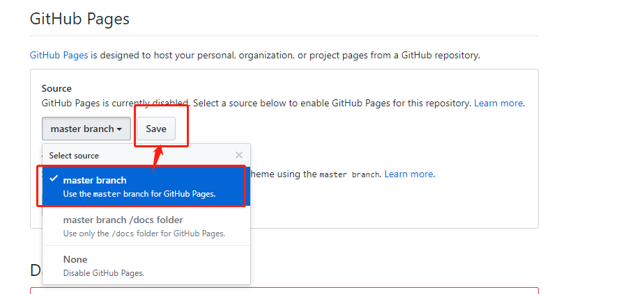 点击 Settings 按钮打开设置页面,页面往下拉到 GitHub Pages 相关设置,在 Source 下面的复选框中选择 master branch ,然后点击旁边的 Save 按钮保存设置。