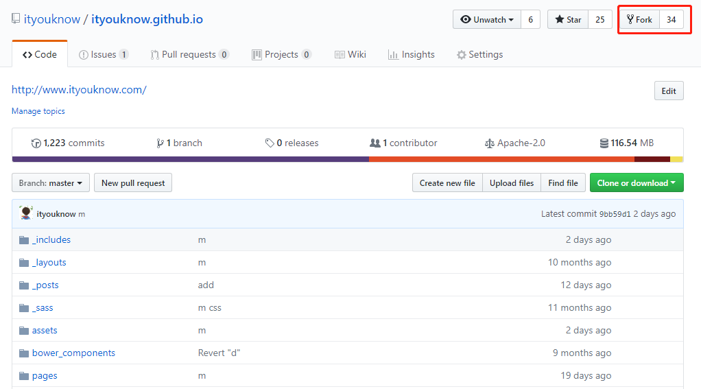 1、首先打开地址https://github.com/ityouknow/ityouknow.github.io,点击 Fork 按钮将代码复制一份到自己的仓库。