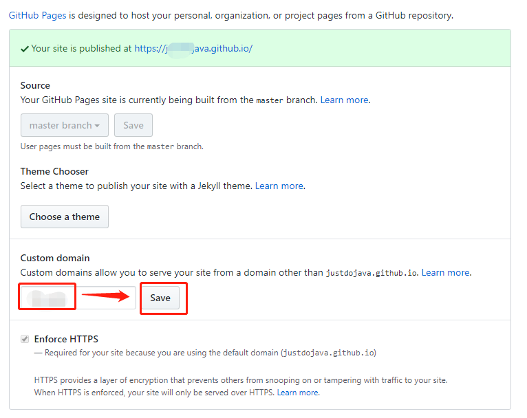 然后重新打开项目的 Settings > GitHub Pages 页面,Custom domain 下的输入框输入刚才设置的域名:xxx.com,点击保存即可。