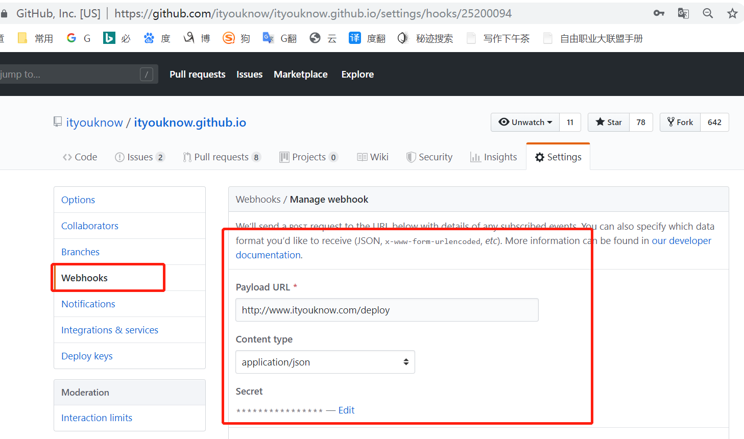 Payload URL: http://www.ityouknow.com/deploy Content type: application/json Secret: 123456