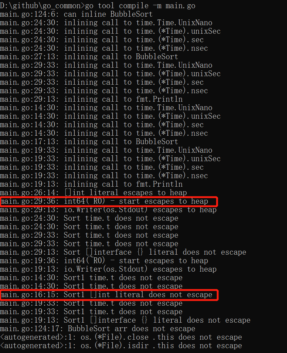 我们这里的arr变量是一个局部变量,那么到底Go将它分配在哪里呢?,我们对这两段代码做反编译分析,写一个main.go文件,在main函数中分别调用两个排序函数,然后执行这个命令:go tool compile -m main.go