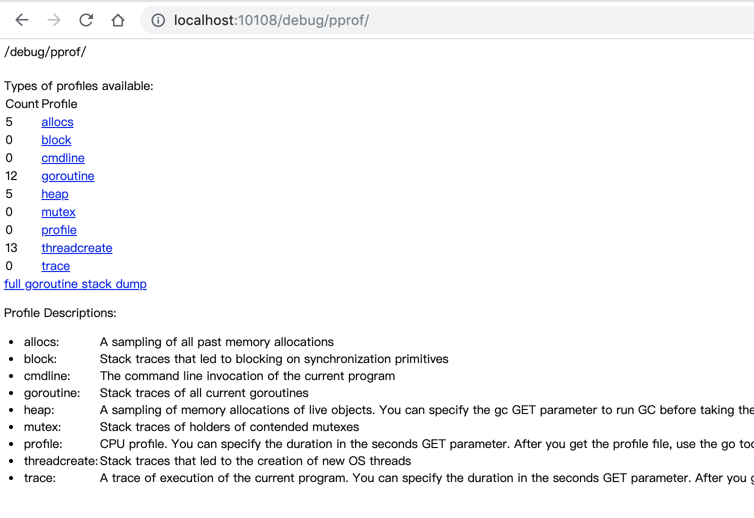 运行之后,在浏览器打开 http://127.0.0.1:10108/debug/pprof/就能看到监控的一些信息了: