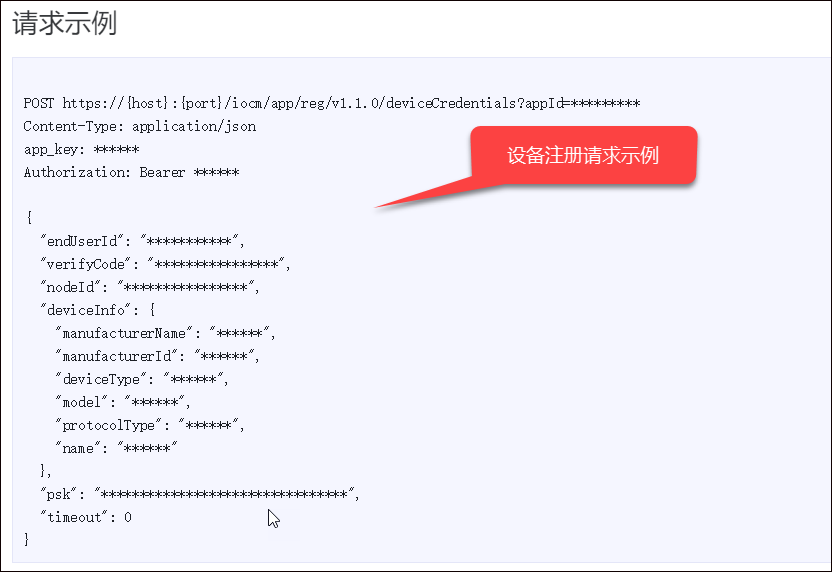 private void btnRegDevice_Click(object sender, EventArgs e) {if (string.IsNullOrEmpty(accessToken)) { MessageUtil.ShowTips("请先鉴权获取AccessToken");return; }var deviceApi = new DeviceApi();var regDeviceInfo = new RegDeviceJson() { endUserId = "64bf5869-b271-4007-8db8-fab185e19c10", nodeId = "64bf5869-b271-4007-8db8-fab185e19c10", psk = "12345678", timeout = 0, verifyCode = "", deviceInfo = new DeviceJson() { deviceType = "Smoke", manufacturerId = "49ac78c99f3e453598c155870efe8bfc", manufacturerName = "iqidi",//与manufacturerId、manufacturerName、deviceType、model和protocolType系列参数二选一//productId = "5d9bf49b6a018f02d04cae28",model = "1001", name = "NBSimulator", imsi = "fafafasfasf", mac = "testetst", isSecurity = true.ToString().ToUpper(), protocolType = "LWM2M", } };var regResult = deviceApi.RegisterDevice(accessToken, regDeviceInfo); Console.WriteLine(regResult != null ? regResult.ToJson() : "no regResult"); }