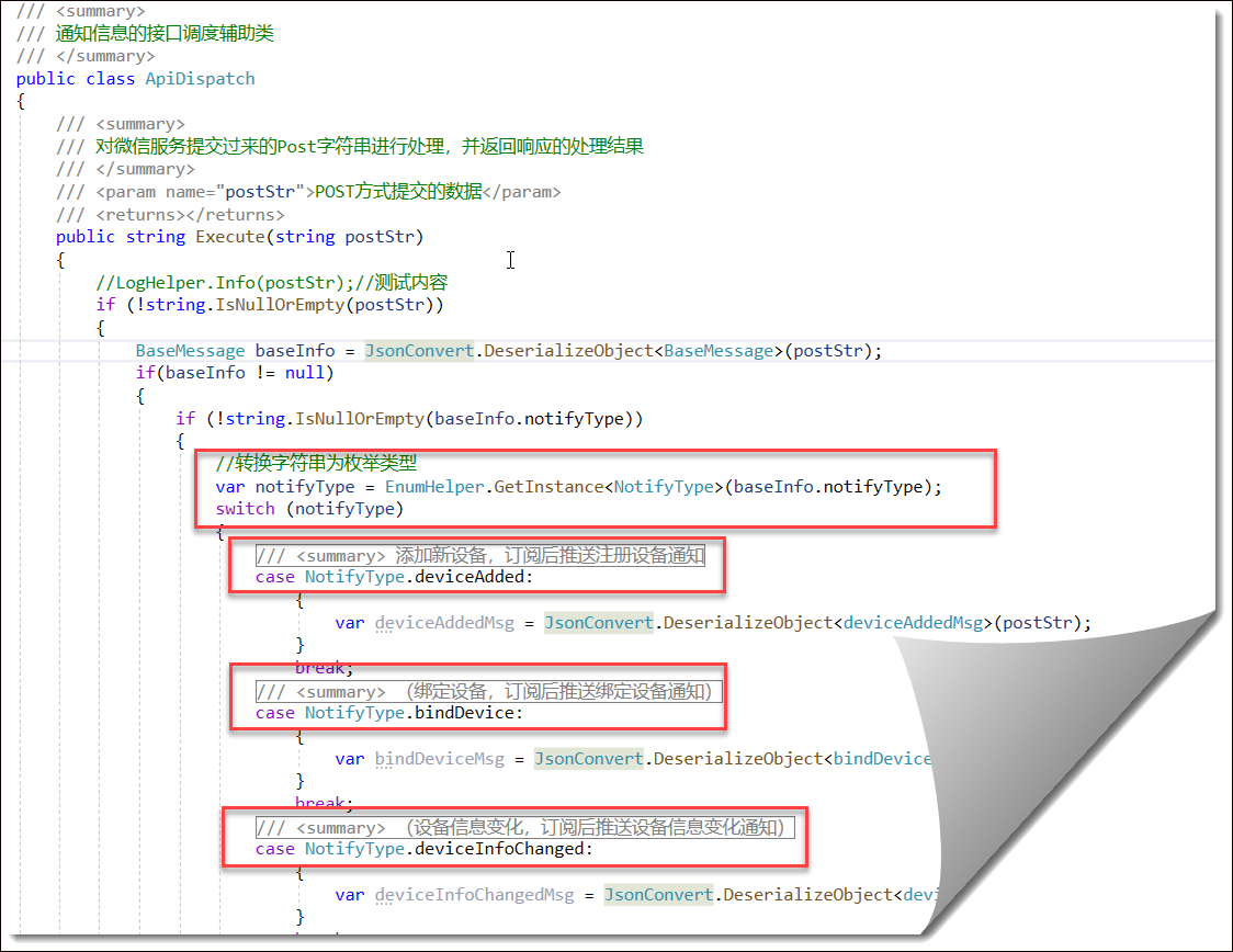 /// <summary>/// 设备管理接口实现/// </summary>public class DeviceApi : BaseCommon, IDeviceApi {/// <summary>/// 注册设备(验证码方式)。/// 在设备接入物联网平台前,应用服务器需要调用此接口在物联网平台注册设备,并设置设备的唯一标识(如IMEI)。/// 在设备接入物联网平台时携带设备唯一标识,完成设备的接入认证。/// </summary>/// <param name="accessToken"></param>/// <param name="info"></param>/// <returns></returns>public RegDeviceResult RegisterDevice(string accessToken, RegDeviceJson info) {var header = GetHeader(accessToken);string postData = info.ToJson();var url = Constants.AppBaseUrl + "/iocm/app/reg/v1.1.0/deviceCredentials";//名称大小写不能错url += string.Format("?appId={0}", Constants.AppId);var result = WeJsonHelper<RegDeviceResult>.ConvertJson(url, postData, header);return result; } ......