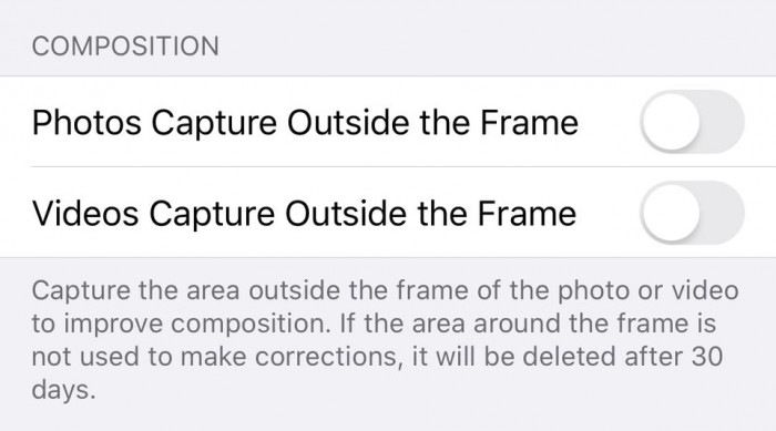 在 iOS 相机设置中,多了一个 Composition 构图选项,可让你启用【框外图像获取】和【框外视频获取】。