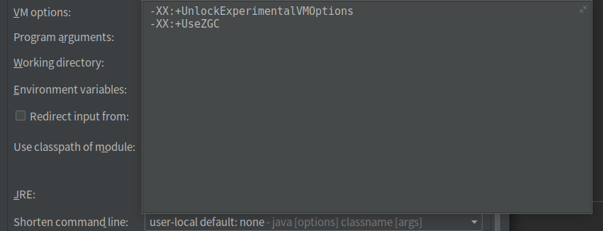-XX:+UnlockExperimentalVMOptions -XX:+UseZGC
