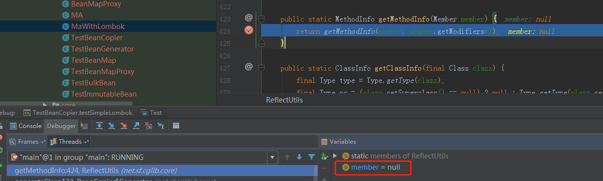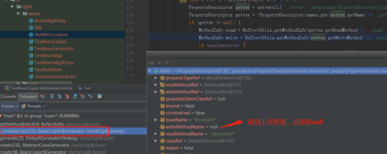 java.lang.NullPointerException at net.sf.cglib.core.ReflectUtils.getMethodInfo(ReflectUtils.java:424) at net.sf.cglib.beans.BeanCopier$Generator.generateClass(BeanCopier.java:133) at net.sf.cglib.core.DefaultGeneratorStrategy.generate(DefaultGeneratorStrategy.java:25) at net.sf.cglib.core.AbstractClassGenerator.create(AbstractClassGenerator.java:216) at net.sf.cglib.beans.BeanCopier$Generator.create(BeanCopier.java:90) at net.sf.cglib.beans.BeanCopier.create(BeanCopier.java:50) at net.sf.cglib.beans.TestBeanCopier.testSimpleLombok(TestBeanCopier.java:38)