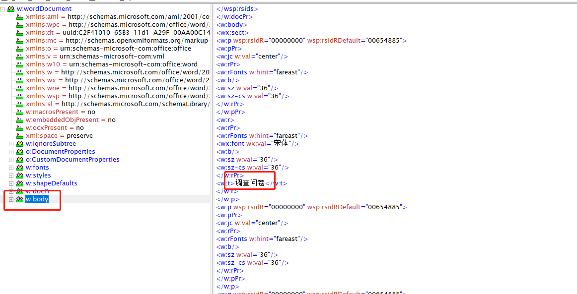 复制过去之后,按f8可以将其进行格式化,左侧是标签,右侧是内容,我们只需要关注w:body即可。