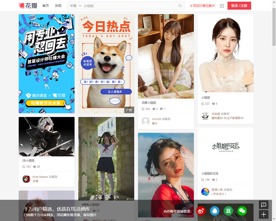 用一张花瓣网页的图片布局可以很清楚看出图片瀑布流的样子: