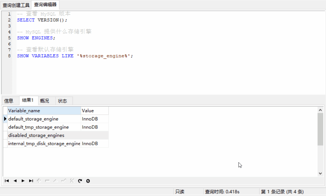 -- 查看 MySQL 版本SELECT VERSION();-- MySQL 提供什么存储引擎SHOW ENGINES;-- 查看默认存储引擎SHOW VARIABLES LIKE '%storage_engine%';
