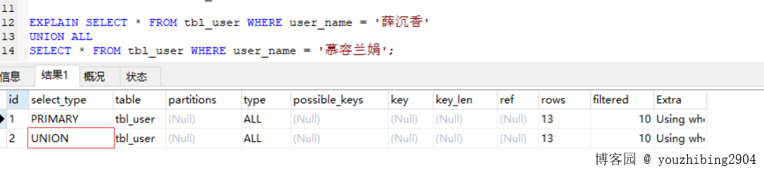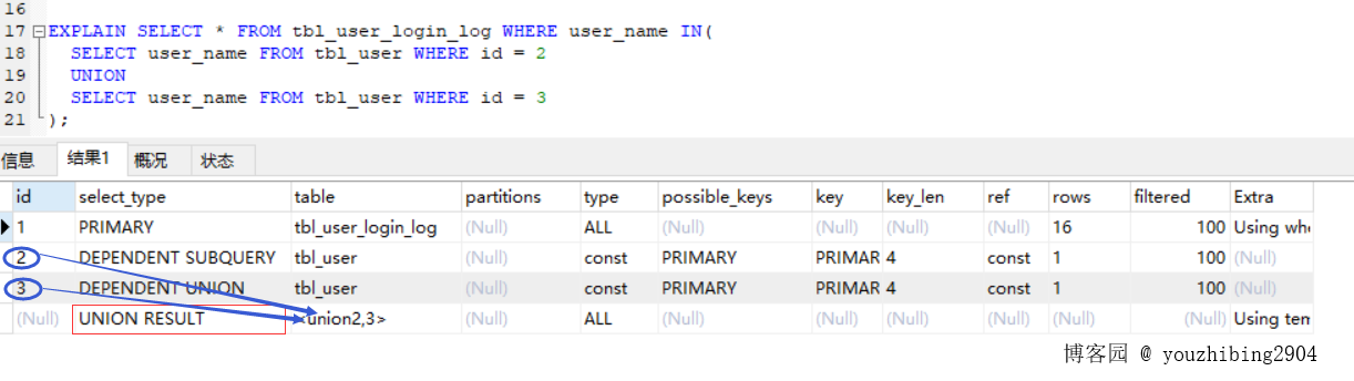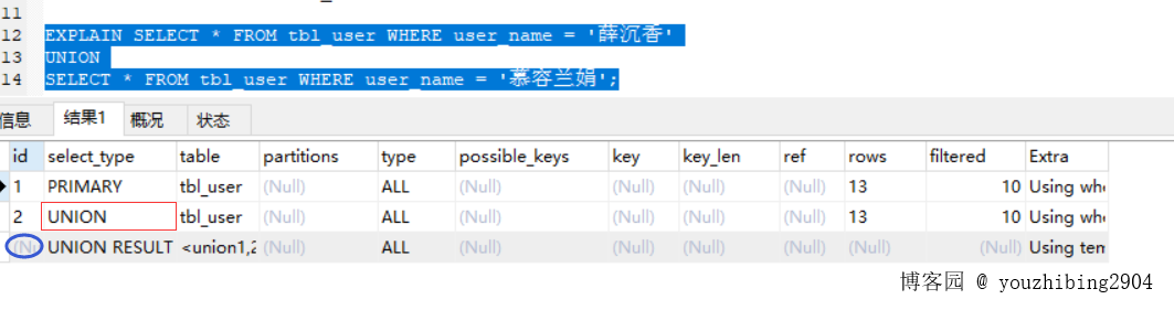 UNION RESULT:UNION 的结果(如果是 UNION ALL 则无此结果)