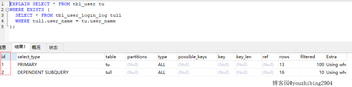 输出的是整数,用来标识整个 SQL 的执行顺序。id 如果相同,从上往下依次执行id不同;id 值越大,执行优先级越高,越先被执行;如果行引用其他行的并集结果,则该值可以为NULL