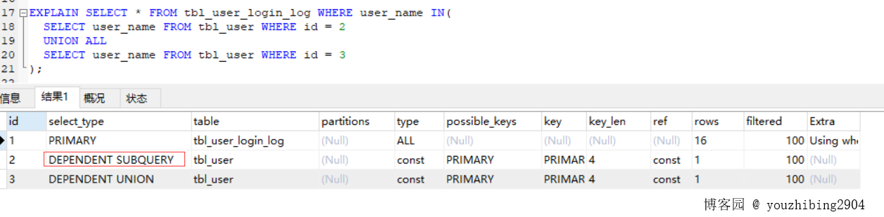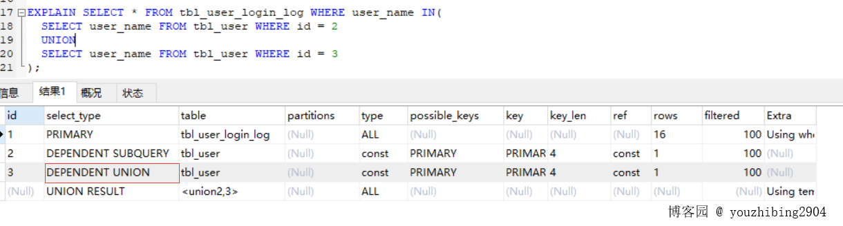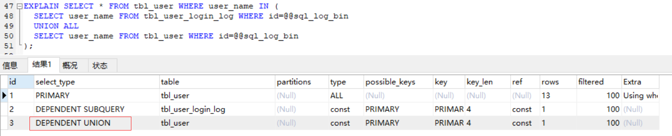 DEPENDENT UNION:UNION 操作的第二个或之后的 SELECT,依赖于外部查询的结果集