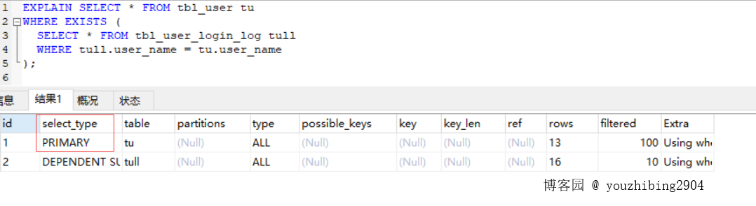 PRIMARY: 最外层的 select 查询,常见于子查询或 UNION 查询 ,最外层的查询被标识为 PRIMARY