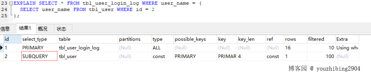 SUBQUERY:子查询中的第一个 SELECT 查询,不依赖于外部查询的结果集