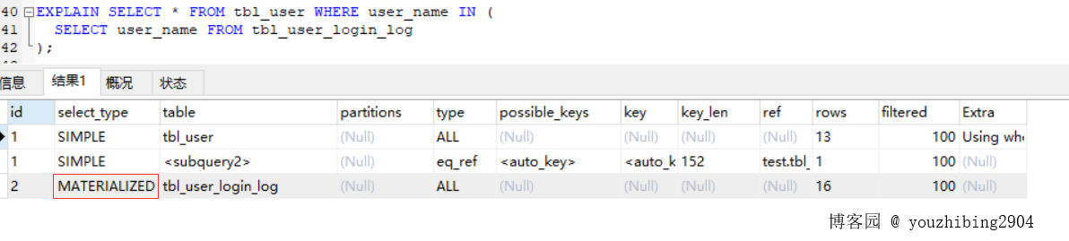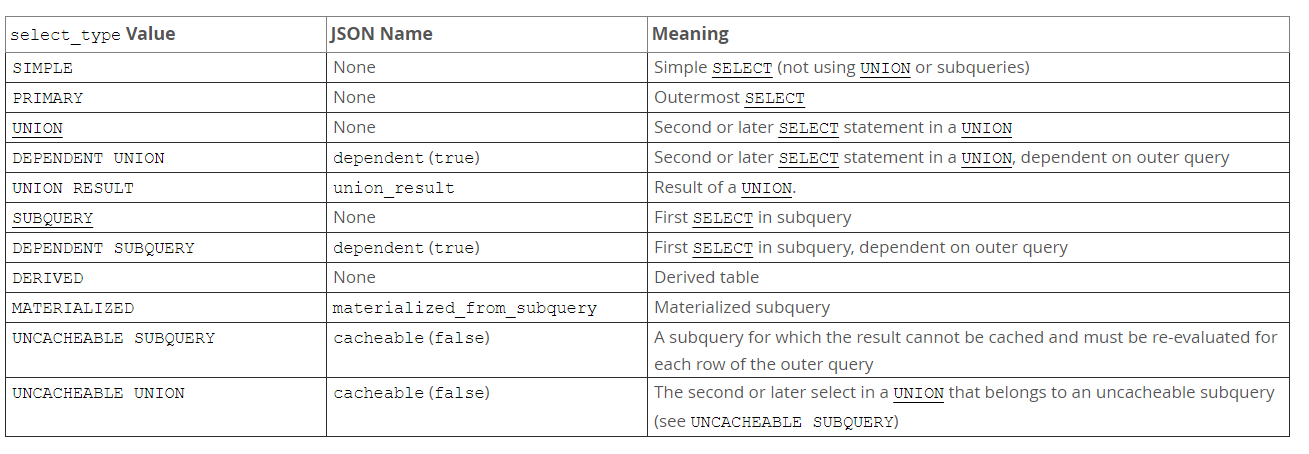 MATERIALIZED:被物化的子查询,MySQL5.6 引入的一种新的 select_type,主要是优化 FROM 或 IN 子句中的子查询,更多详情请查看:Optimizing Subqueries with Materialization
