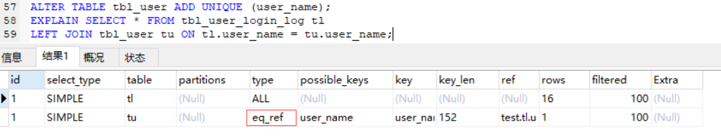 对于每个来自于前面的表的行,从该表最多只返回一条符合条件的记录。当连接使用的索引是 PRIMARY KEY 或 UNIQUE NOT NULL 索引时使用,非常高效