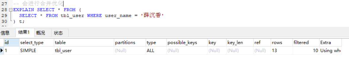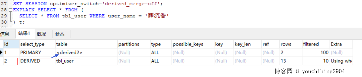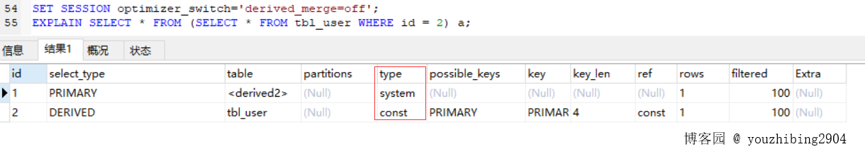 注意:MySQL5.7 中对 Derived table 做了一个新特性,该特性允许将符合条件的 Derived table 中的子表与父查询的表合并进行直接JOIN,从而简化简化了执行计划,同时也提高了执行效率;默认情况下,MySQL5.7 中这个特性是开启的,所以默认情况下,上面的 SQL 的执行计划应该是这样的