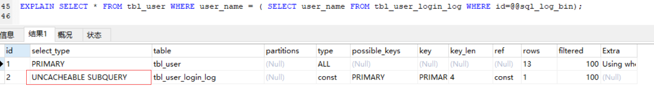 UNCACHEABLE SUBQUERY:对于外层的主表,子查询不可被缓存,每次都需要计算