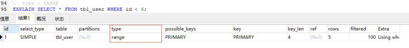 使用索引来检索给定范围的行,当使用 =、<>、>、>=、<、<=、IS NULL、<=>、BETWEEN 或者 IN 操作符,用常量比较关键字列时,则会使用 rang
