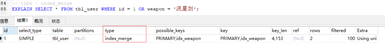 这个同样也是有条件的, id 列和 weapon 列都有单列索引。如果出现 index_merge,并且这类 SQL 后期使用较频繁,可以考虑把单列索引换为组合索引,这样效率更高