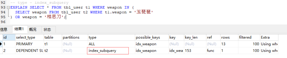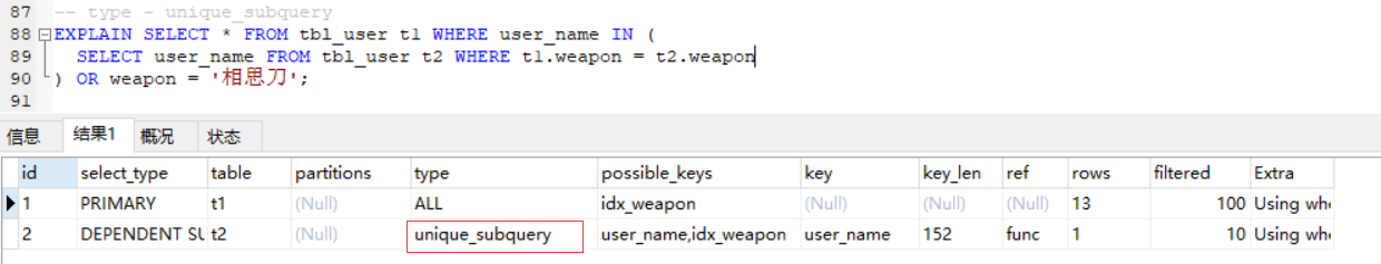 index_subquery 与 unique_subquery类似,只不过访问子查询中的表时使用的是普通的索引