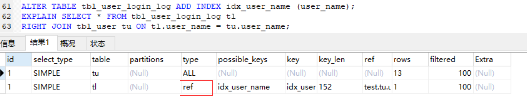 索引访问,也称索引查找,它返回所有匹配某个单个值的行。此类型通常出现在多表的 JOIN 查询, 针对于非 UNIQUE 或非 PRIMARY KEY, 或者是使用了最左前缀规则索引的查询,换句话说,如果 JOIN 不能基于关键字选择单个行的话,则使用ref