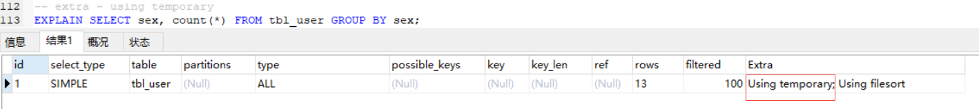 表示 mysql 需要使用临时表来存储结果集,常见于排序和分组查询