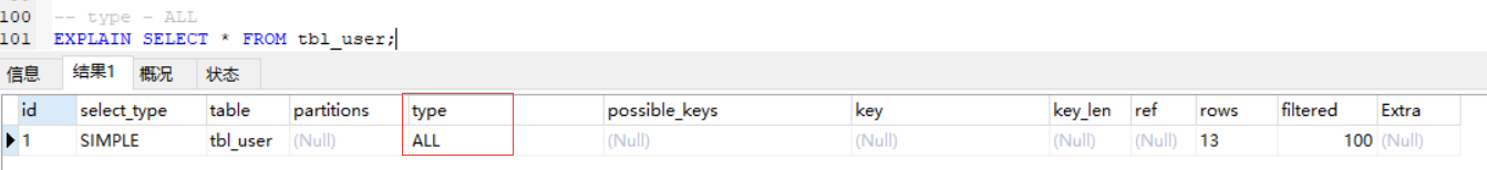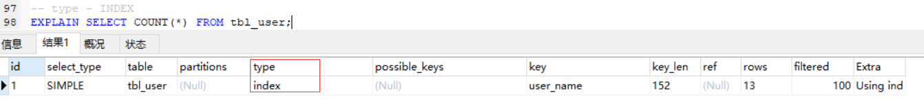 当我们可以使用索引覆盖,但需要扫描全部的索引记录时,则会使用 index;进行统计时非常常见