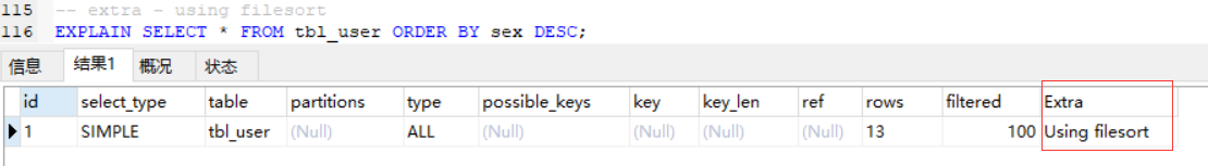 表示 mysql 无法利用索引直接完成排序(排序的字段不是索引字段),此时会用到缓冲空间(内存或者磁盘)来进行排序;一般出现该值,则表示 SQL 要进行优化了,它对 CPU 的消耗是比较大的
