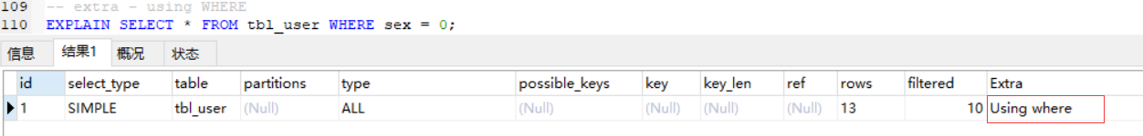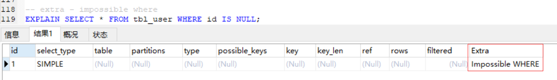 查询语句的WHERE子句永远为 FALSE 时将会提示该额外信息