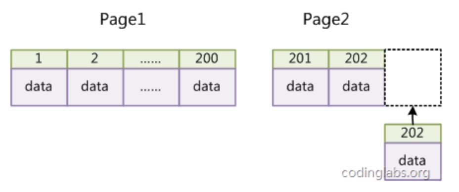 上文讨论过InnoDB的索引实现,InnoDB使用聚集索引,数据记录本身被存于主索引(一颗B+Tree)的叶子节点上。这就要求同一个叶子节点内(大小为一个内存页或磁盘页)的各条数据记录按主键顺序存放,因此每当有一条新的记录插入时,MySQL会根据其主键将其插入适当的节点和位置,如果页面达到装载因子(InnoDB默认为15/16),则开辟一个新的页(节点)。