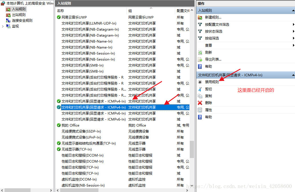 Windows Defender-》防火墙-》高级设置-》入站和出站规则-》文件和打印机ipv4-》开启规则