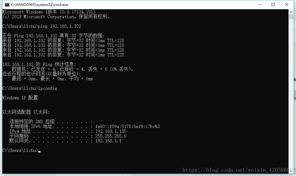 通过命令查看ip和远程ping能否跑通,如下可以看到已经通了