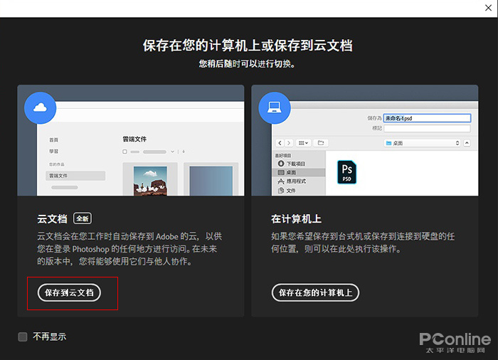 PS 2020新增加了一项云文档功能,你可以将做好的作品直接保存到Adobe云中,以便与其他设备或设计师交换文件。考虑到前几天Adobe刚刚发布了完整版iPad PS,这项功能其实是打通了Windows、Mac、iPad之间最后一道交换屏障,实用性还是不用说的。云文档采用Adobe账号登录,每次在你按下Ctrl+S时自动弹出,整个过程有点像微软的Office云。当然除了使用这个选择面板外,你也可以点击保存对话框里的“存储到云文档”,在两者间来回切换。