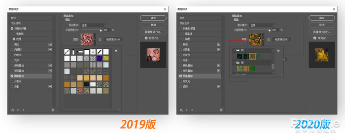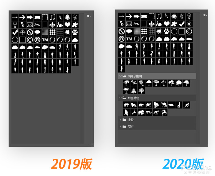 “预设”在新版中变化很大,首先是所有的预设都加入了分组,比如渐变、图案、样式、色板、形状。好多地方都是由文件夹划分,相比2019版条理更清晰。此外2020版也在之前版本基础上,对预设库做了扩展,无论是色彩、形状、图案,你都能找到很多与以前不一样的地方,有些无需追加就能直接体验。