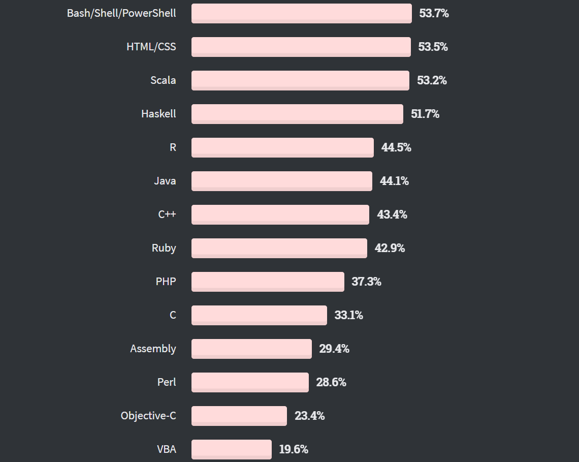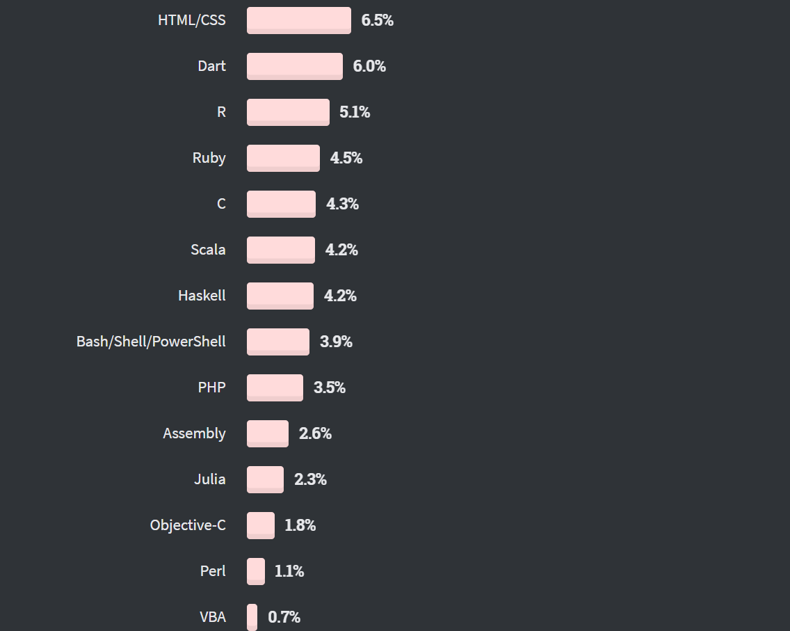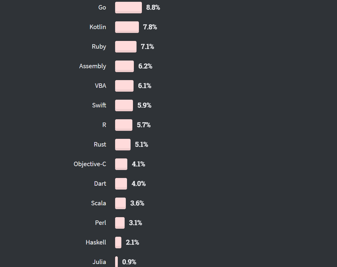 连续八年,JavaScript 都位列最受欢迎的编程语言榜首。此外,TypeScrip 在受欢迎程度方面领先于 C。Ruby 在 2017 年曾一度跻身该榜单的前十名,但如今却有所下降,被 Go 和 Kotlin 等所超越。