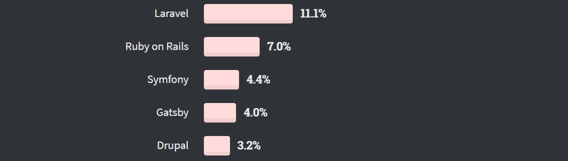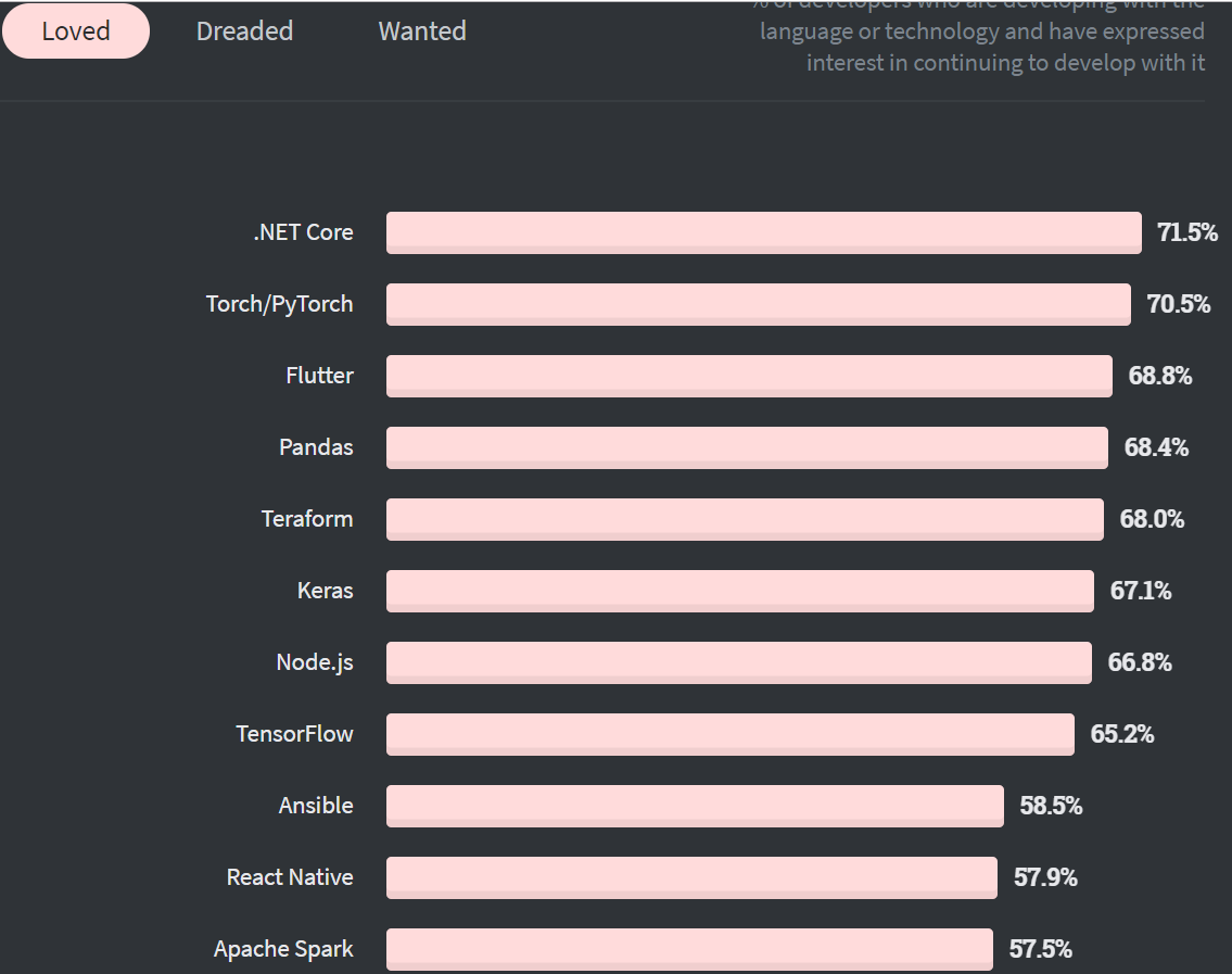 ASP.NET Core 击败了 React.js 成为最受欢迎的 Web 框架。新参与进来的 Gatsby 已排在第 5 位,受到 60% 的受访者的喜爱。React.js 仍是开发者最希望学习的 Web 框架。