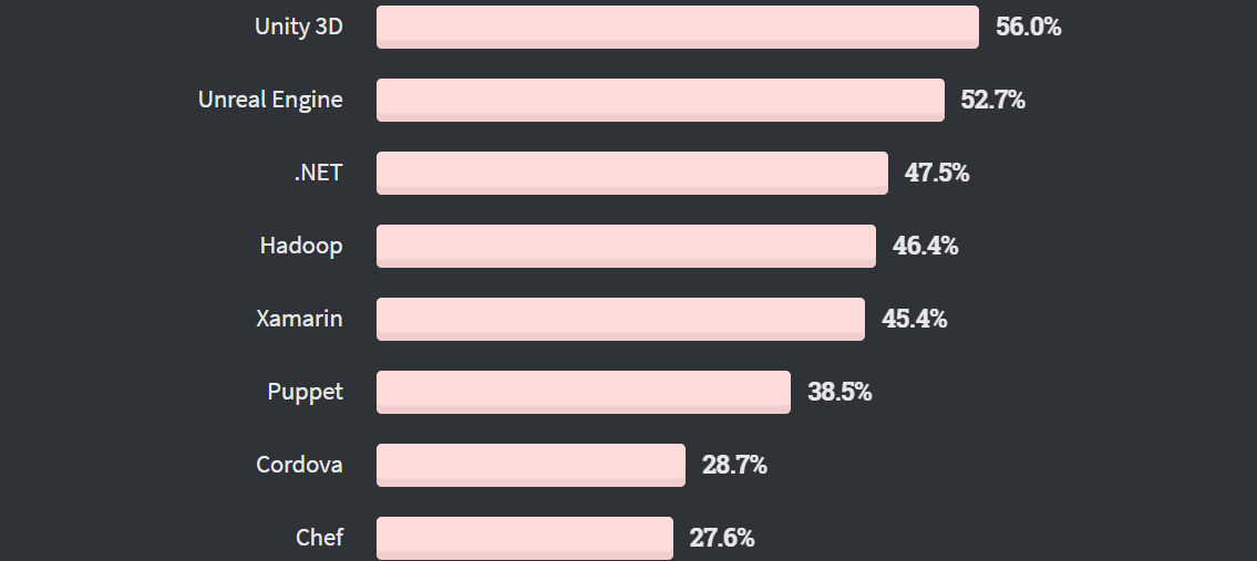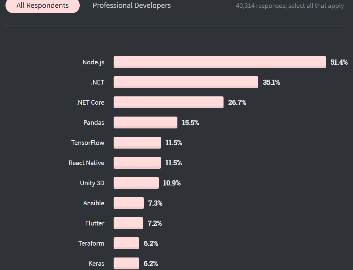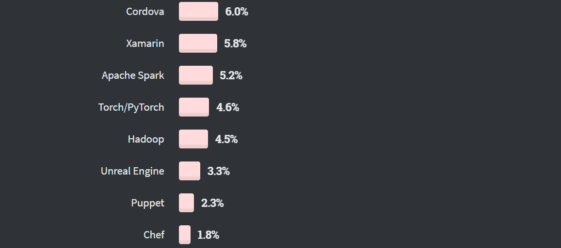 Node.js 连续第二年位居榜首,一半的受访者使用它。数据分析和机器学习技术(例如 Pandas、TensorFlow 和 Torch / PyTorch)开始普及并全面增长。
