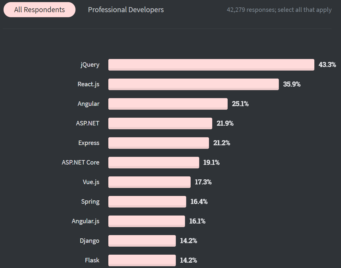 可以看到,在 2020 年的调查中,jQuery 仍拥有最广泛的使用量,但它却在逐年缓慢地输给 React.js 和 Angular。有超过 35% 的受访者表示其正使用 jQuery、React、一个 Angular 版本(将 Angular(代表Angular 2+)和 Angular.js 组合在一起)或某种 ASP.NET(ASP.NET 或 ASP) .NET Core)。