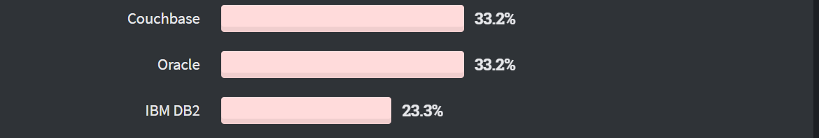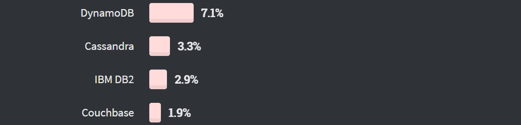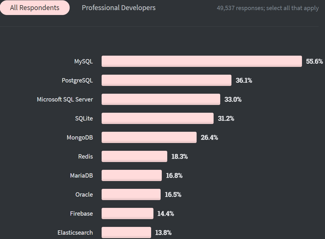 大部分结果与去年观察到的一致。MySQL 一直位居榜首,其次是 PostgreSQL 和 Microsoft SQL Server。但是,Firebase 的受欢迎程度略有增长,今年它在 Elasticsearch 方面有所优势。