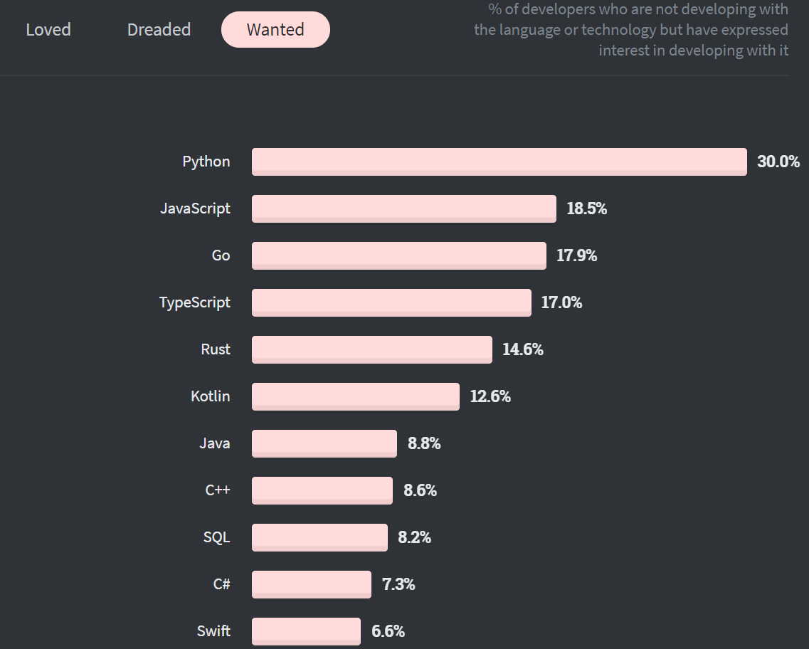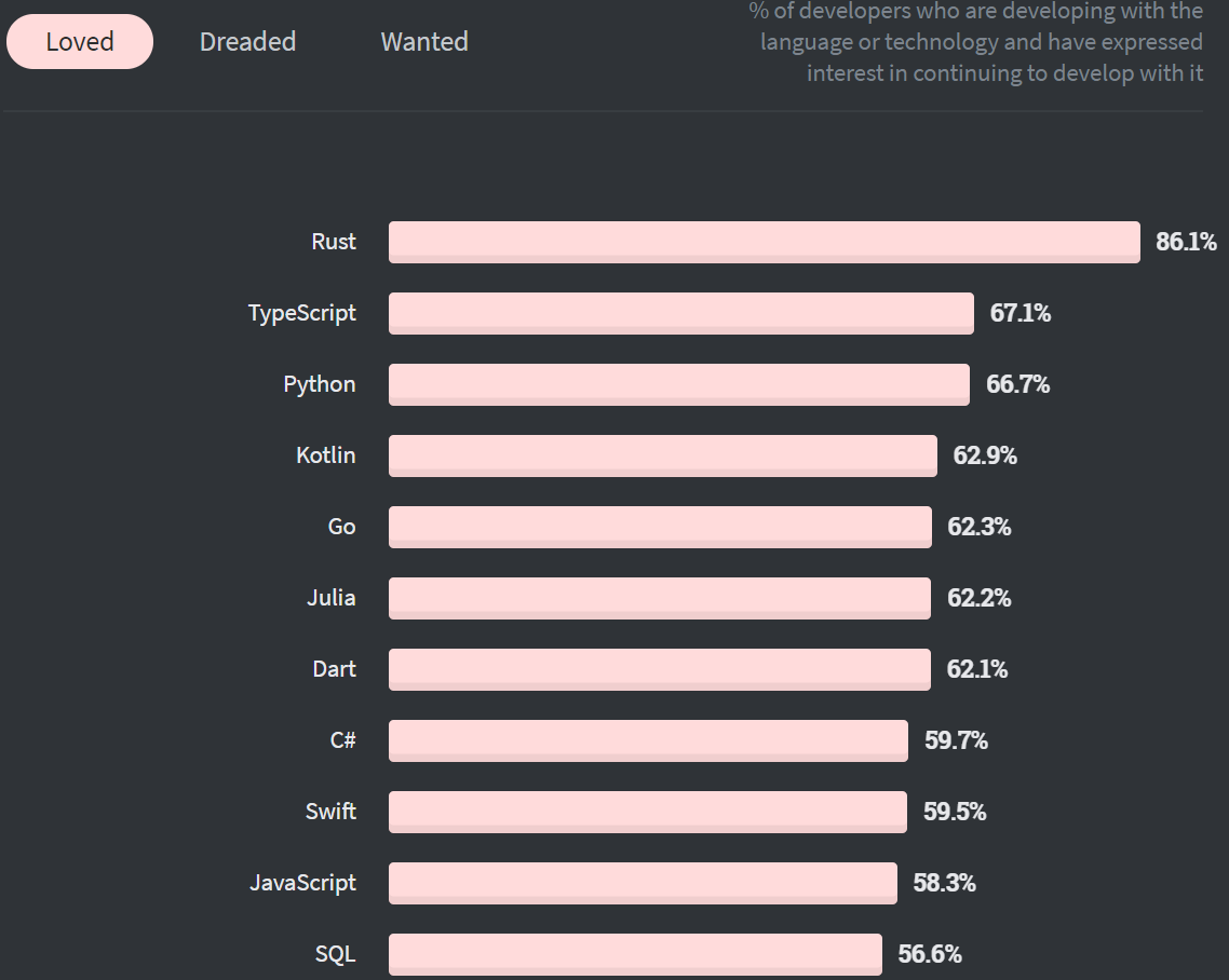 连续五年来,Rust 一直是最受喜爱的编程语言,位居榜首。与去年相比,TypeScript 超越 Python 位居第二。Go 取得了很大的进步,从去年的第 10 位上升到第 5 位。